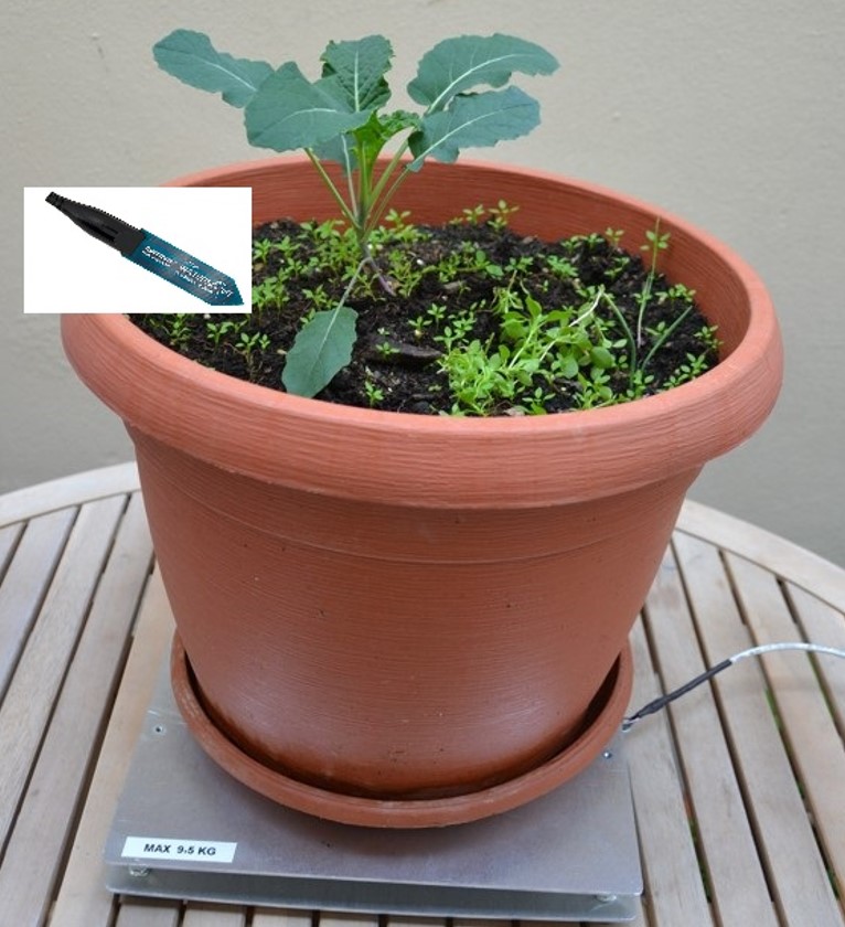Bilancia collegata a datalogger per la registrazione del peso di vasi fino a 10 kg.